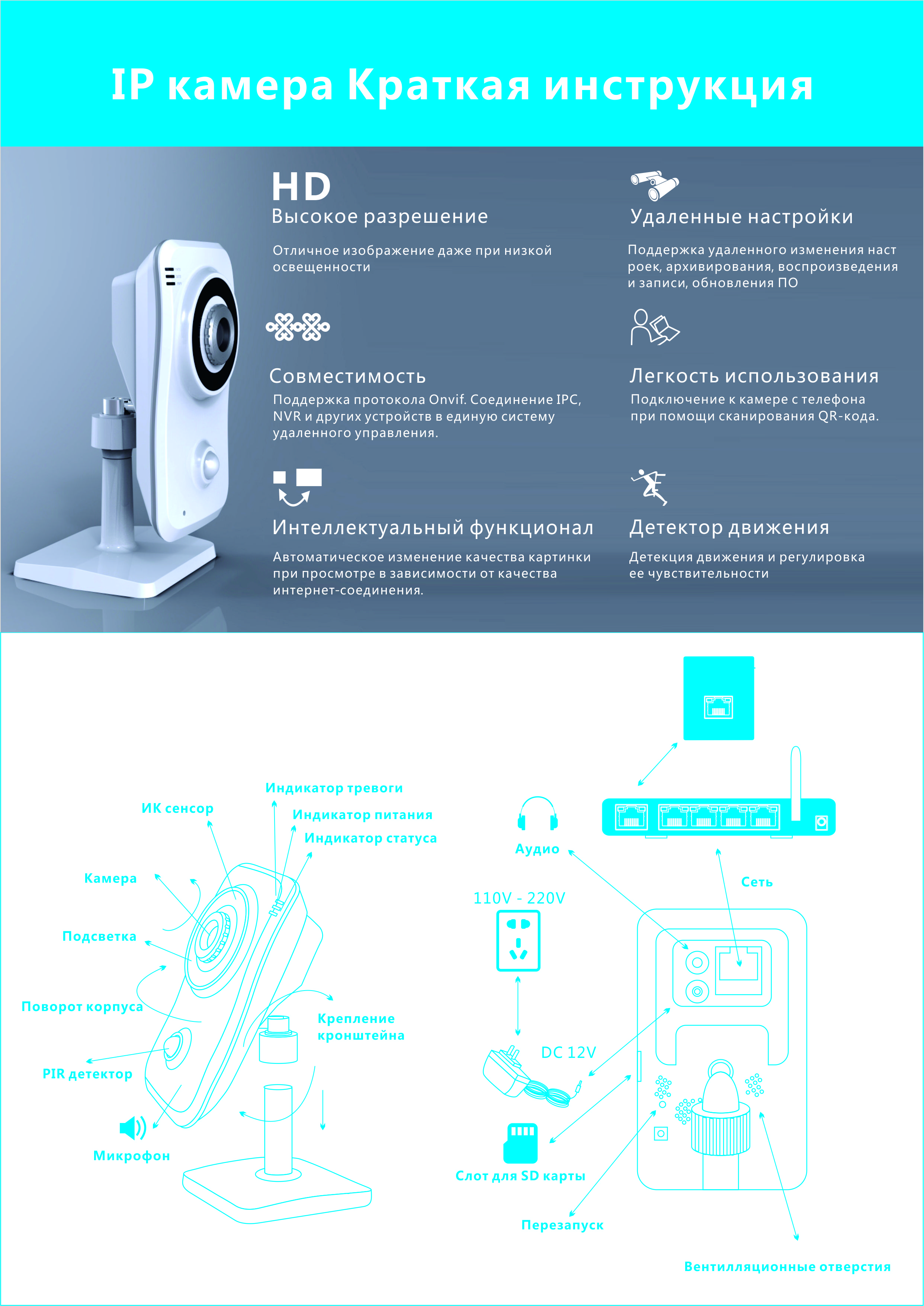- TCP/IP, UDP, HTTP, FTP, SMTP, DDNS, DNS, PPPoE, DHCP, UPnP, RTSP, NTP,встроенный микрофон;
