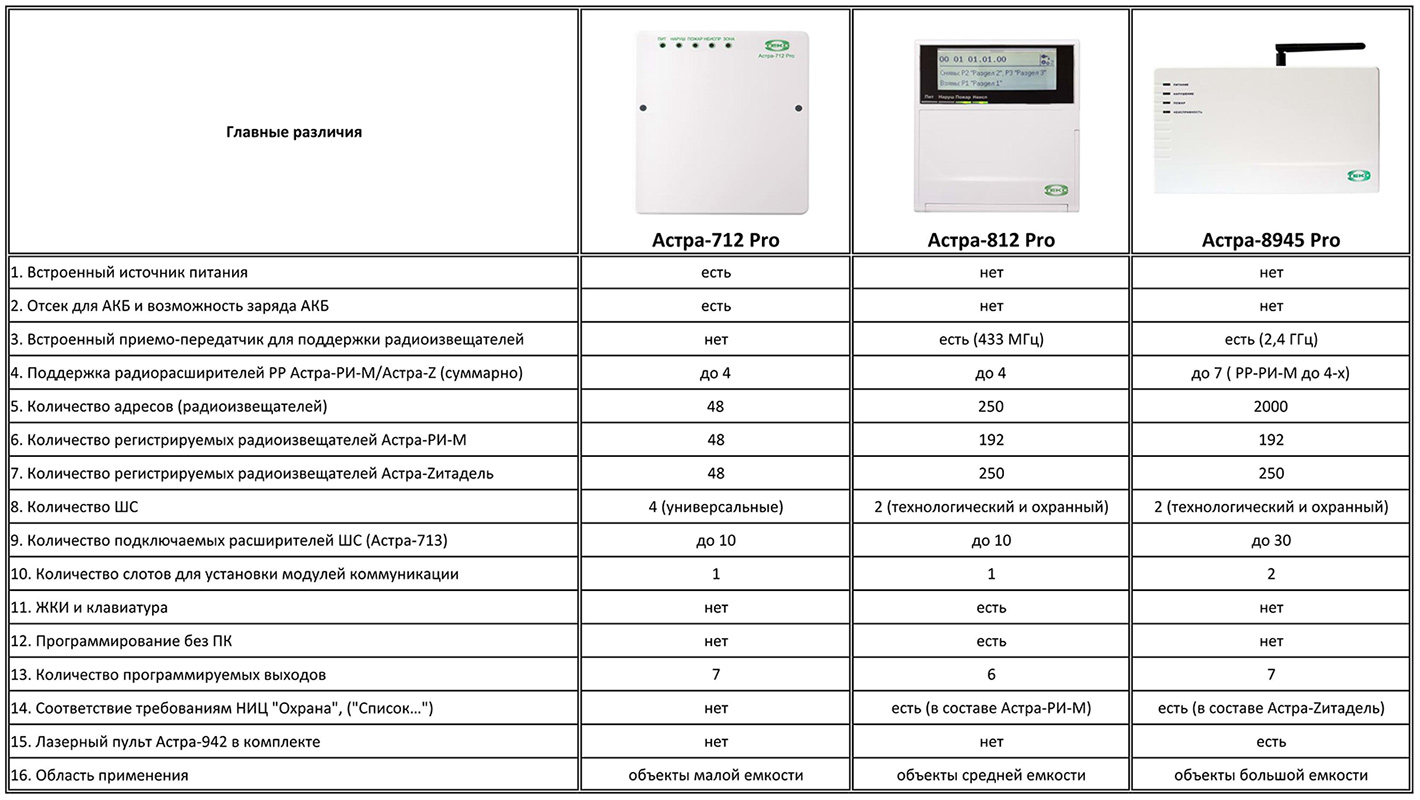 - количество подключаемых проводных пультов контроля и управления Астра-814 Pro (ПКУ) – до 8;