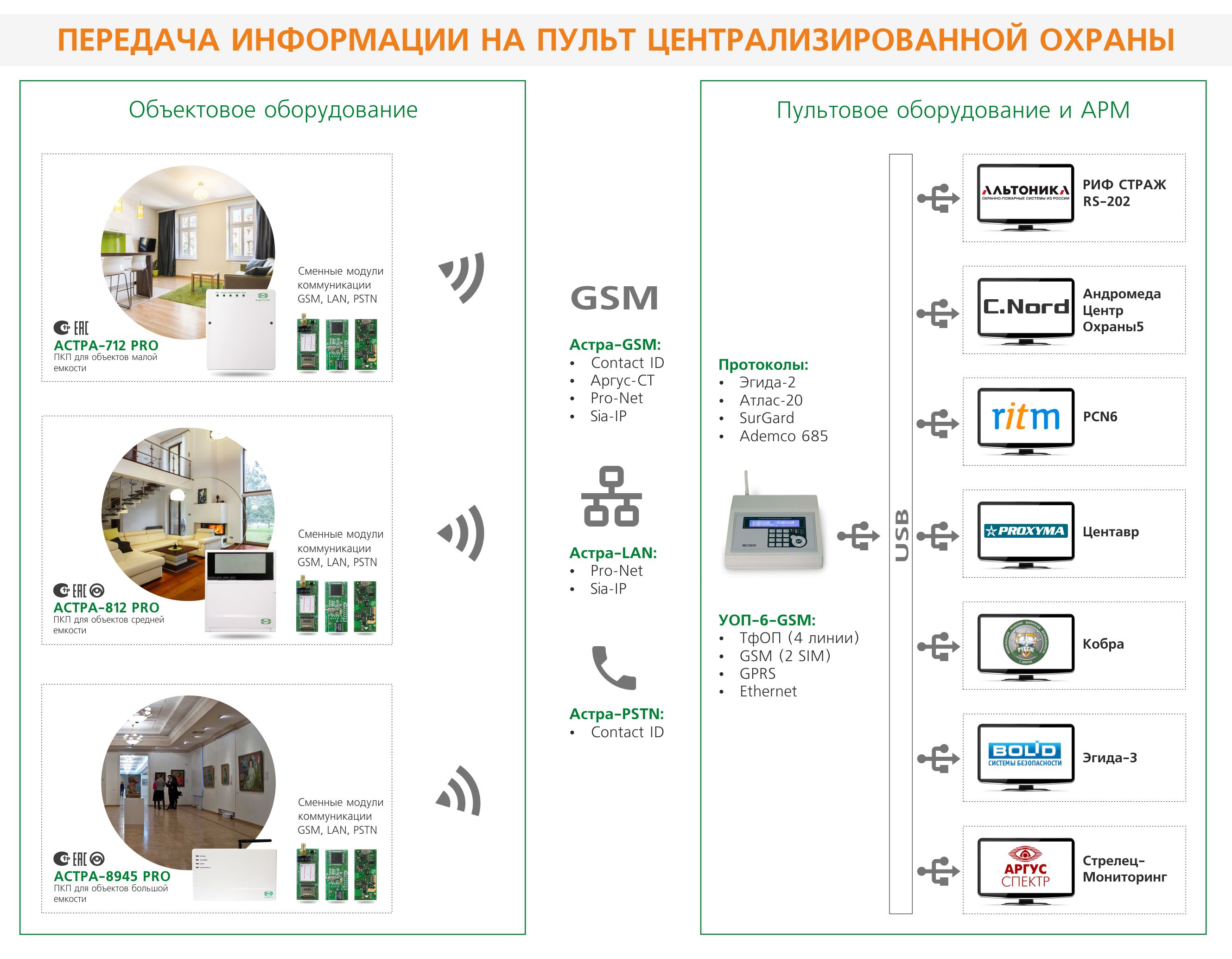 - модуля Астра-LAN (обеспечивает передачу информации в протоколах PRO-net и SIA IP в сетях с TCP/IP, обеспечивает информационный обмен с ядрами ПКМ, размещенными на удаленных ПК и серверах),