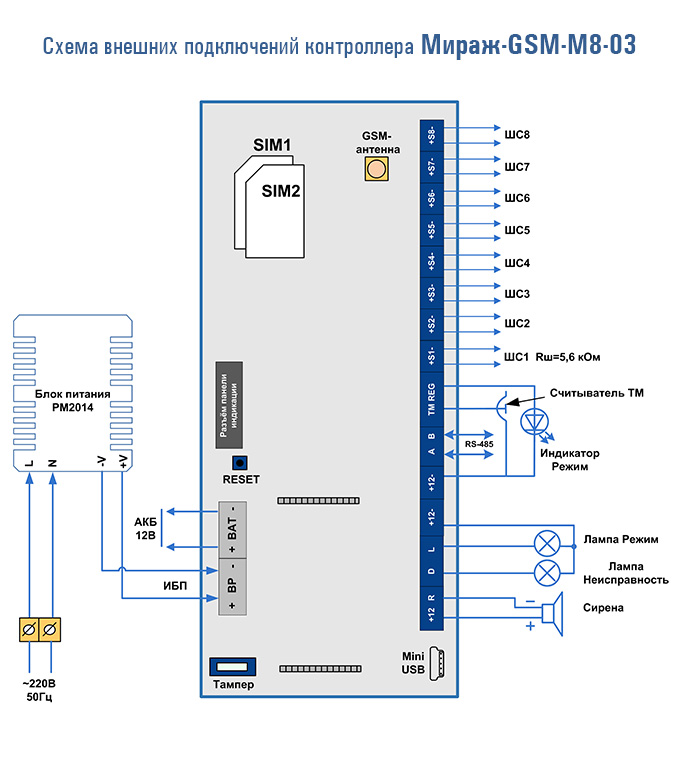 - 8 конфигурируемых шлейфов сигнализации (ШС) для приема извещений от ручных и автоматических пожарных и охранных извещателей, приборов приемно-контрольных охранных и охранно-пожарных через выходы реле;