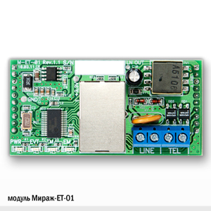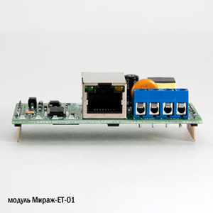 Модуль Мираж-ET-01 обеспечивает передачу сообщений по сети Ethernet и проводным телефонным линиям, расширяя функционал контроллеров Мираж-GSM-M8-03 и STEMAX MX810. Интерфейс Ethernet позволяет установить проводное подключение контроллера к сети Интернет через локальную сеть объекта. Обмен данными между контроллером и станцией мониторинга осуществляется по собственному стеку протоколов TCP/IP, что обеспечивает безопасность передачи данных. Между контроллером и станцией мониторинга устанавливается постоянное онлайн-соединение. Поддерживается протокол ICMP (Ping).
