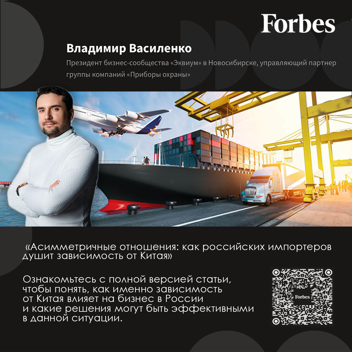 Владимир Василенко стал экспертом Forbes В колонке для Forbes президент бизнес-сообщества «Эквиум» в Новосибирске и управляющий партнер группы компаний «Приборы охраны» Владимир Василенко рассказывает о мерах, которые могли бы помочь российскому бизнесу в текущей ситуации, и о возможных опасностях. В недавней статье на Forbes под названием "Асимметричные отношения: как российских импортеров душит зависимость от Китая" Владимир Василенко глубоко анализирует проблемы и вызовы, с которыми сталкиваются российские импортеры в условиях высокой зависимости от китайских товаров. В статье отмечается, что зависимость российских предпринимателей от Китая становится все более ощутимой, что создает угрозу для устойчивости бизнеса. Владимир Василенко рассматривает не только экономические, но и политические аспекты данной зависимости, подчеркивая риски, которые возникают для бизнеса в условиях нестабильности. Также обращается внимание на необходимость диверсификации поставок и поиска альтернативных рынков для уменьшения рисков и повышения конкурентоспособности российских компаний. В условиях меняющегося геополитического ландшафта задачи, стоящие перед импортерами, становятся все более сложными. Ознакомьтесь с полной версией статьи, чтобы понять, как именно зависимость от Китая влияет на бизнес в России и какие решения могут быть эффективными в данной ситуации. https://www.forbes.ru/mneniya/525879-asimmetricnye-otnosenia-kak-rossijskih-importerov-dusit-zavisimost-ot-kitaa |